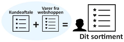 Dit sortiment består altså af de varer du selv har udvalgt i webshoppen eller dem vi opretter til dig + de varer du evt. har indgået en kundeaftale med os om.