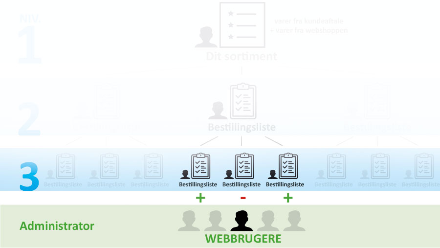 Som administrator af hovedkontoen, kan du oprette brugere og tildele dem rettigheder i forhold til dine bestillingslister. Det er typisk medarbejdere man opretter, som dermed kan logge ind i webshoppen og bestille præcis fra de bestillingslister du har defineret, at de har adgang til.
